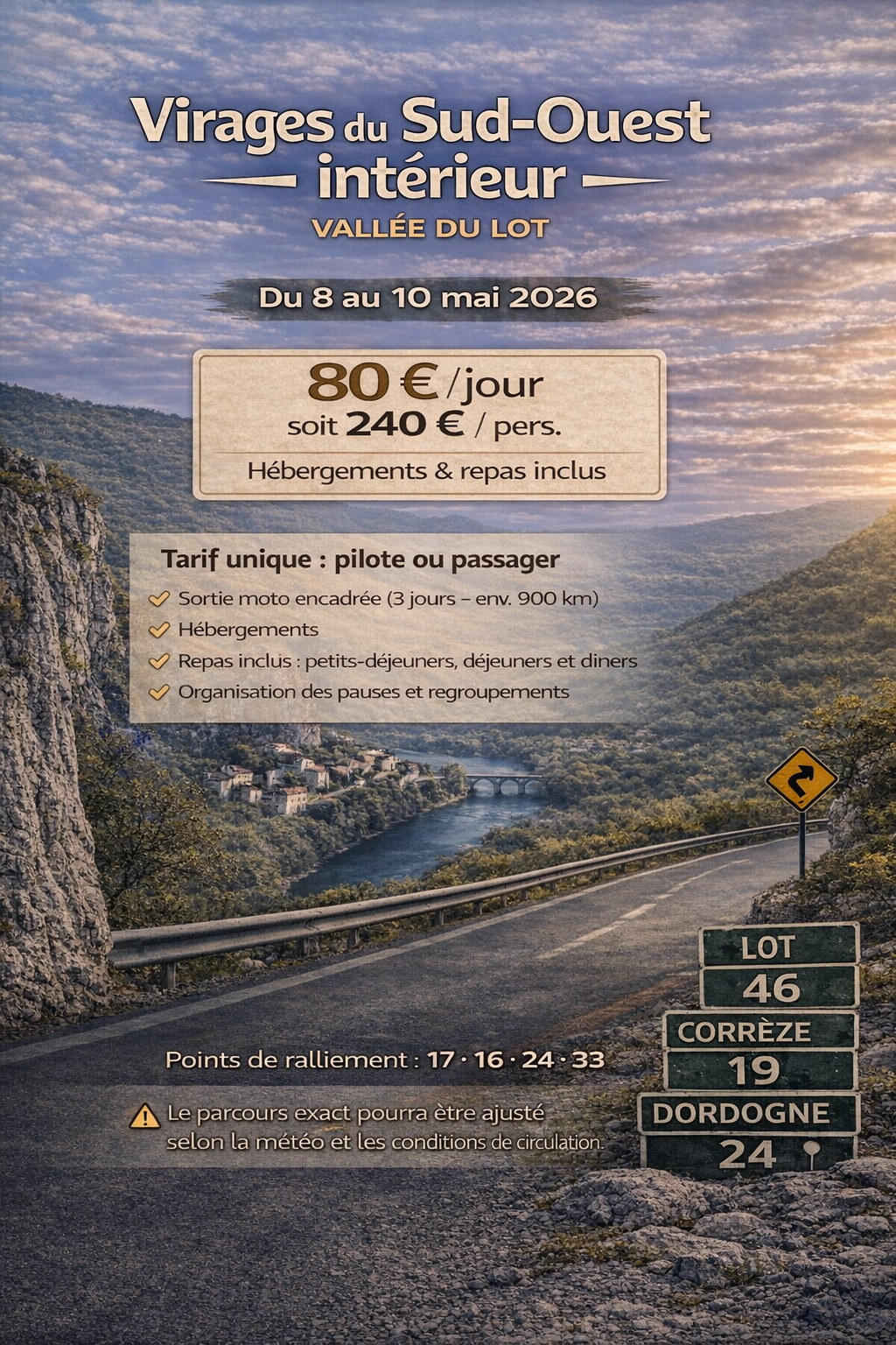 Un week-end intense de 443 km à travers le Bordelais : visites de domaines viticoles, balades, et une initiation XLS 125 vintage le samedi soir autour d’un barbecue au camping à la ferme de Naulet.